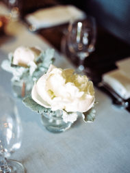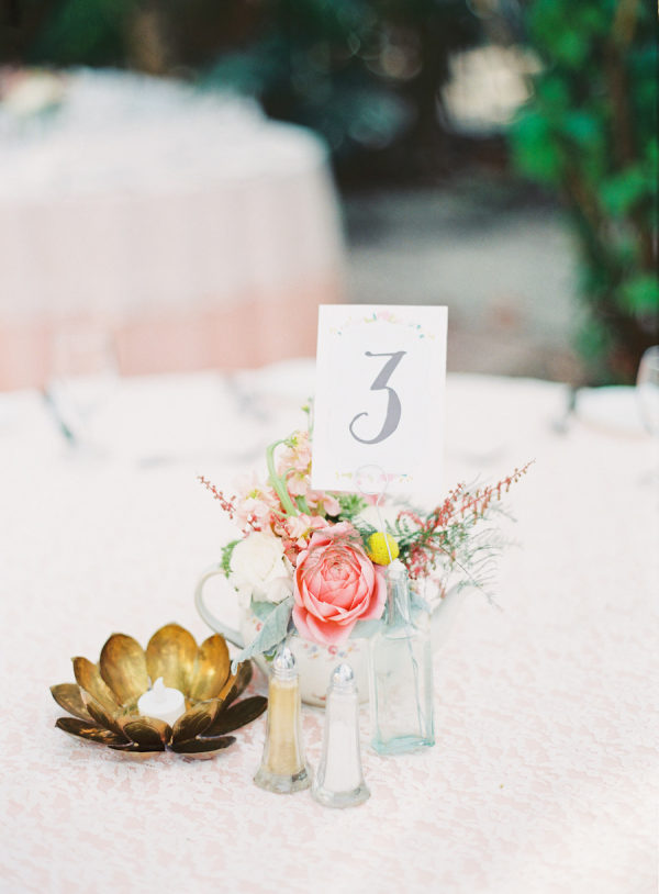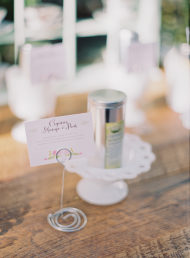 Jorge loves classic English cinema and I love tea and anything floral so we were inspired by our likes and decided to have a romantic floral garden tea-party wedding. Throughout the year, I collected vintage teapots, tea cups, vases and any floral inspired decor. On one of my many trips to the thrift store, I spotted two wicker heart-shaped chairs; like a cartoon character with bulging hearts for eyes, I fell in love with them immediately! They were so perfect for our wedding. I later found out, via Pinterest, that Kate Moss had the exact same chairs at her wedding! Made me love our chairs even more. We truly love all of our guests and since it was relatively small wedding we were able to add special touches to make them feel loved. One of my favorites was the spool place card holders. Jorge’s dad cut about 80 spools by hand! I then had my lovely bridesmaids help me stain them and finally wrap them with mint colored lace. Our guests loved to see their name displayed in such cute way. We also found some awesome cardboard teaspoons online that we used as escort cards. Each of them had a fun trivia question on the back to strike up a conversation. As favors, we gave each guest tea bags so they could go by our tea station and pick their favorite flavored loose tea to take home.