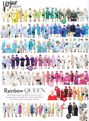 If you ever wondered why a certain shade of blue is called "royal" - British VOGUE's helpful and witty chart should explain why. The magazine noted every outfit worn by the Queen over the last year and found that 29 per cent of the coats, dresses, suits and hats she wore over the last 12 months were predominantly blue..