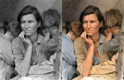 First (courtesy of my brother) – a series of colorized photographs by Swedish artist Sanna Dullaway. While Dullaway’s main business is restoring old family photographs, she has taken to re-imagining iconic images with enough skill and verisimilitude that the issue it addresses is not colorization (of course it’s weird and disrespectful, but occasionally effective) but about the power of black and white photography. In a world of color, it’s amazing what effect black and white has. (Perhaps this why the film “The Artist” has taken such a hold on people.) Dullaway’s motive is simple. She writes on her Flickr site: "Hi. I take coloured photographs. If I stumble upon colourless photographs I colour them." If only everyone were so honest!
